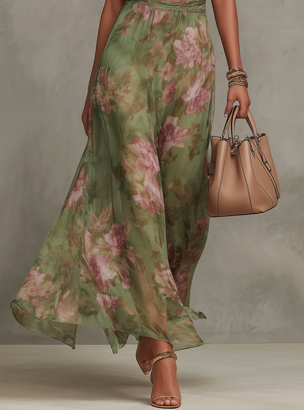 La falda fluida sigue cada paso con ligereza, aportando movimiento y un toque refinado. El delicado estampado floral añade ese detalle romántico que no pasa desapercibido, sin resultar excesivo.